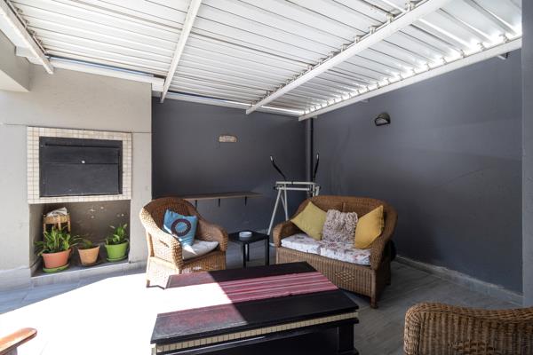 Sliding doors from the living areas open onto a covered entertainment patio complete with a built-in braai and louvre roof. This elevated space overlooks the full wraparound garden, creating the ideal setting for outdoor dining, summer barbecues, and peaceful mornings surrounded by greenery.