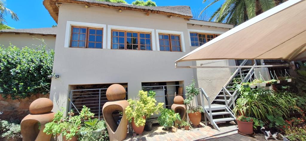 This beautiful property offers a perfect blend of comfort and functionality, featuring a well-maintained garden, a swimming pool, and a separate one-bedroom flatlet. The main house consists of three spacious bedrooms, each with its own en-suite bathroom, along with two lounges, a dining room, a TV room, a study, and a fully equipped kitchen with a scullery and a gas stove. For entertainment, there is a lapa area, ideal for gatherings. The property includes a garage accommodating four cars and additional covered parking for five vehicles. The flatlet comprises a bedroom, a full bathroom, a kitchen, a lounge, and a scullery, making it ideal for rental income. Additional features include a laundry room, an outdoor room with a separate toilet and shower, four ceiling fans, two air conditioning units, a fireplace, JoJo water tanks, and an electric gate. Although the borehole and electric fence are currently non-functional, the property still offers great potential. With a charming thatched roof and a rental income opportunity of R5,500 per month, this home is both a beautiful and practical investment.