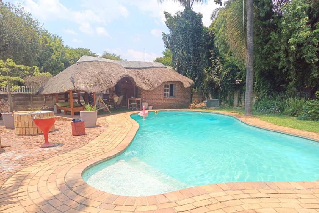 Outdoor living is elevated with a swimming pool and an enclosed thatched lapa, creating a relaxed space for year-round braais, gatherings, or quiet downtime.