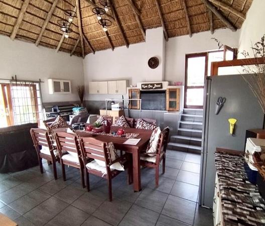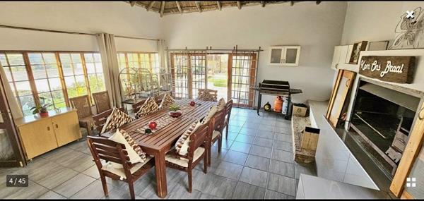 The huge 80m2 braai room with thatched roof, is equipped with a lovely built in braai. This entertainment room opens to your pool area, where everybody can have a ball!