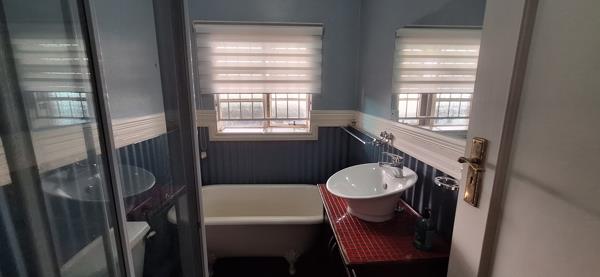 2 full bathrooms, featuring a clawfoot tub, pedestal sink, and glass shower