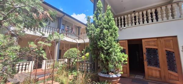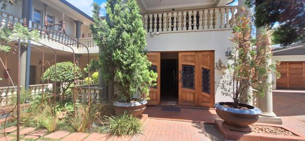 Presenting an exceptional residential offering in the esteemed suburb of Colbyn, Pretoria, South Africa. This distinguished property, set on a generous 1317 sqm erf, exudes classical architectural elegance, immediately evident from its stately columns, balustrade balconies, and grand ornate wooden double entrance doors. The meticulously maintained exterior features a brick-paved driveway, covered parking, and a double garage, complemented by mature trees and established landscaping that enhance its kerb appeal.