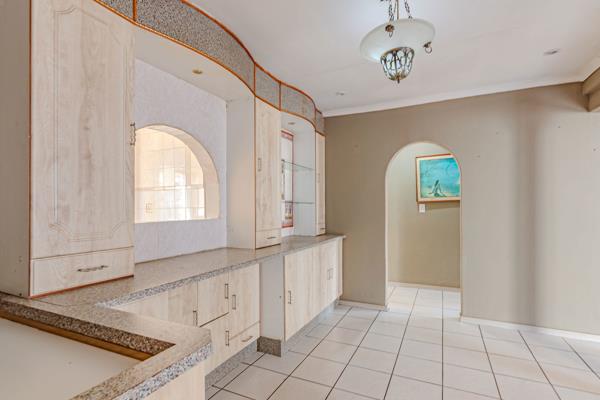 - A generous open-plan living and dining area with beautiful pillars separating them.