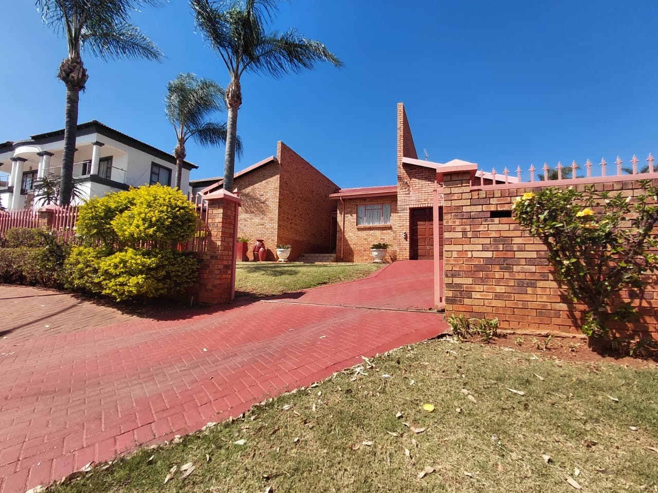 Discover an exquisite residential offering, perfectly poised within a vibrant metropolitan setting. This distinguished property immediately captivates with its impressive kerb appeal, featuring a distinctive brick architectural facade, a grand red brick paved driveway, and mature palm trees that lend an established, verdant charm. The secure perimeter, defined by a robust brick wall and elegant fenced access gate, ensures privacy and peace of mind for discerning homeowners.