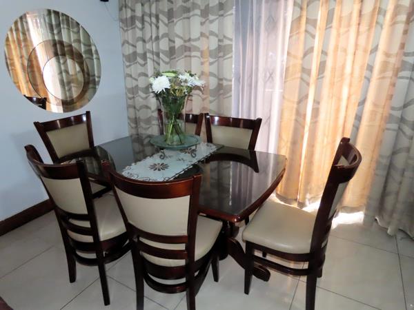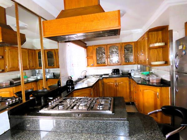 Spanning 135 square metres, the interior comprises three well-appointed bedrooms main bedroom includes an air-conditioner, two bathromms one en-suite, providing comfortable accommodation. The spacious living area is complemented by a dedicated dining room, both featuring durable tiled flooring, fostering an inviting atmosphere for both relaxation and formal gatherings. The kitchen serves as a central hub, equipped with abundant warm-toned wooden cabinetry, dark granite countertops, a modern gas stove top integrated into an island and a double oven.