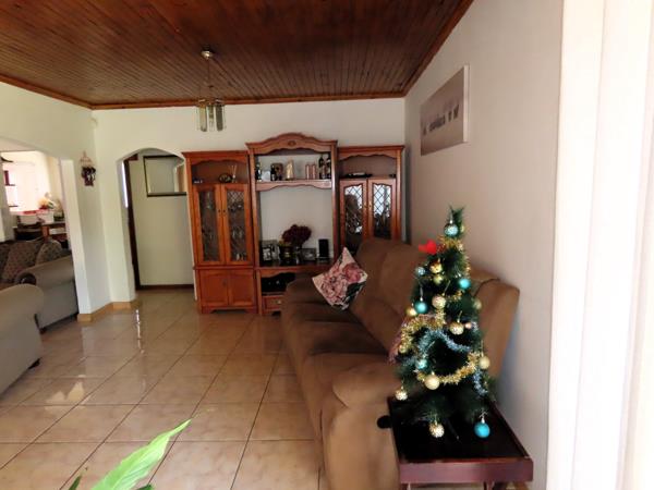 This expansive property, boasting a generous floor size of 240 square metres with an outbuilding of 44 sqm on a 446 square metre erf, presents a welcoming ambiance upon entry. The interior is characterised by spacious living areas featuring distinctive warm wood-paneled ceilings and durable tiled flooring throughout, ensuring both aesthetic appeal and ease of maintenance. The layout thoughtfully integrates a dedicated lounge, a family tv room and a separate dining room, providing versatile spaces suitable for both formal entertaining and relaxed family gatherings. Natural light permeates these areas through large windows, some fitted with security bars for enhanced safety.