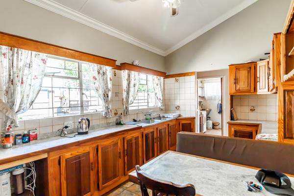 - Large kitchen with ample solid wood cupboards, a double sink, and a loose standing oven and hob