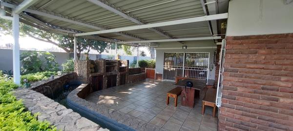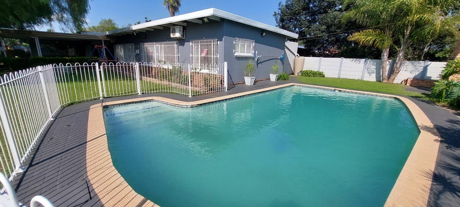 Sparkling swimming pool with an open Braai area.