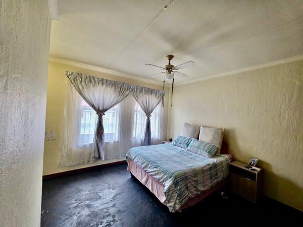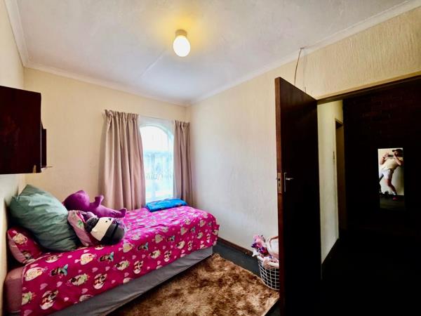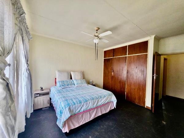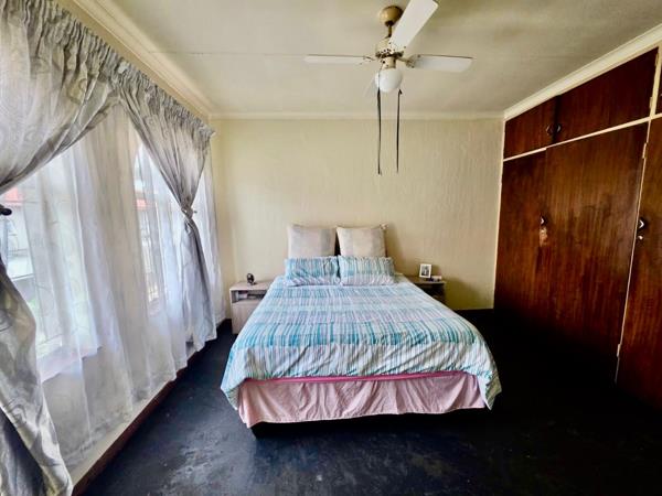 The home comprises two comfortable bedrooms, each benefiting from ample natural light. One bedroom features practical built-in wooden wardrobes, offering convenient storage solutions. Both bedrooms include ceiling fans for comfort and security bars on the windows for peace of mind. The single bathroom, equipped with a bathtub and toilet, features white tiled walls and an arched window. While currently functional, it presents an excellent opportunity for a complete renovation to introduce modern fixtures, updated tiling, and a fresh, clean design.