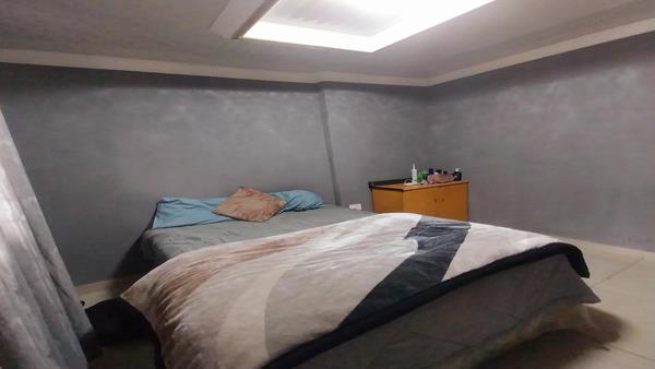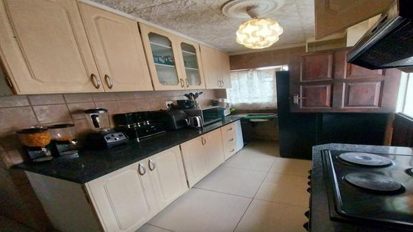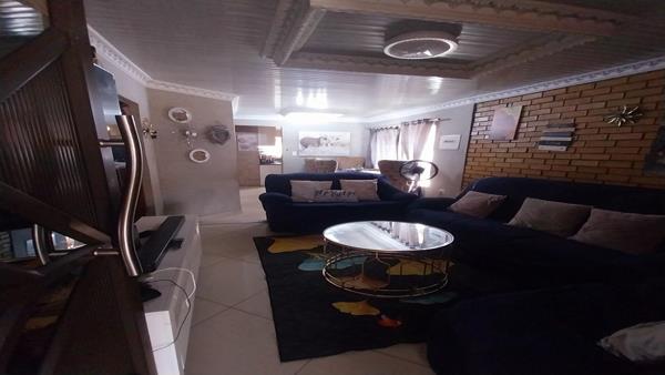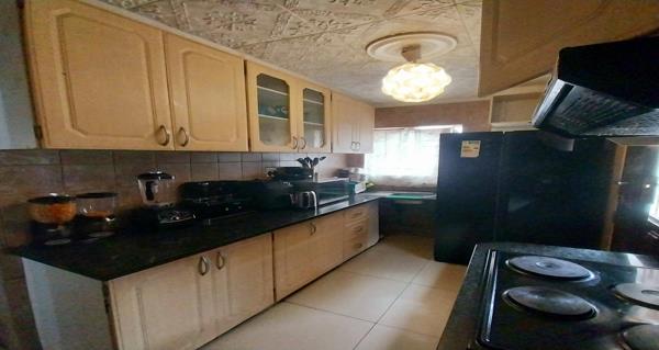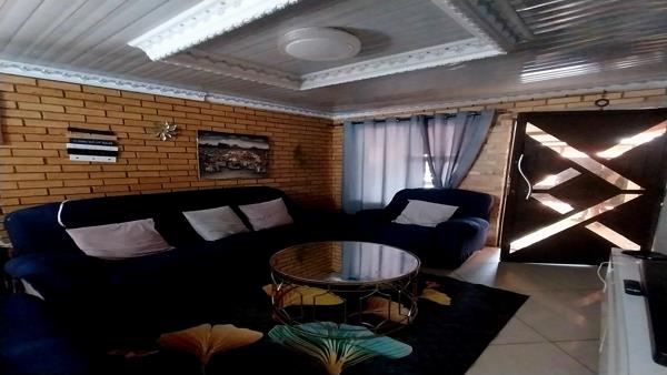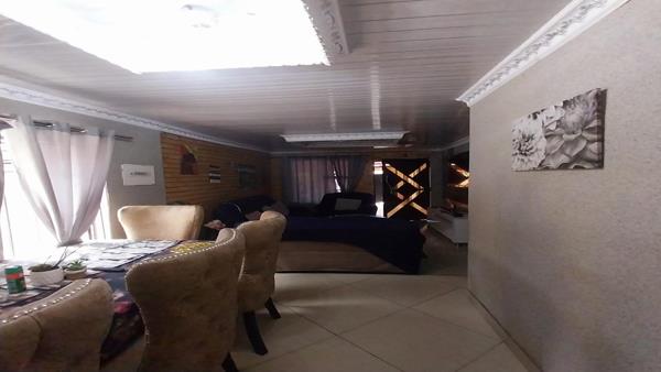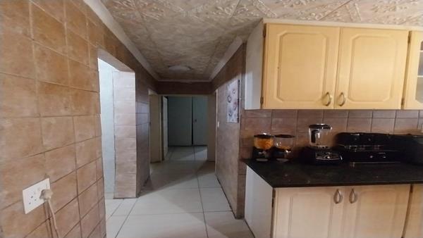 The house itself offers a Lounge at the front door with a Dining room that can fit a 6-seater table and set in an open plan. The Kitchen brags with lots of built-in cupboards, an electric stove and oven with melamine counter tops.
