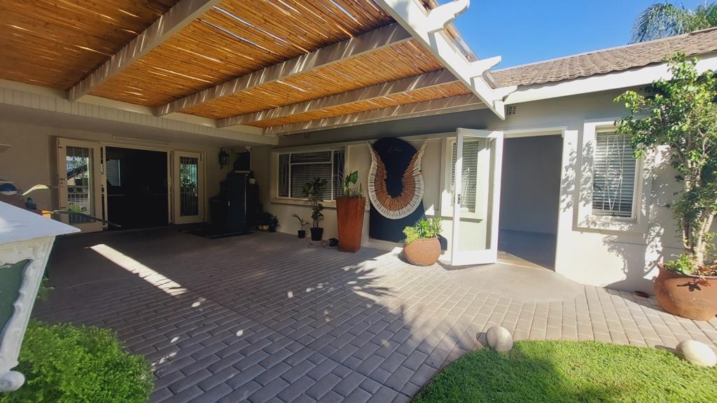 Beautifully covered stoep can easily cover space for a large outside dining table. Leads to the front door.