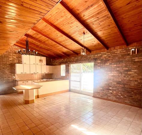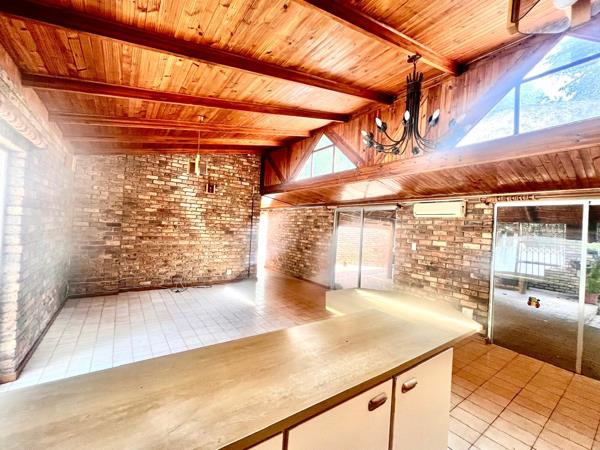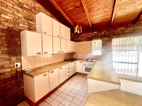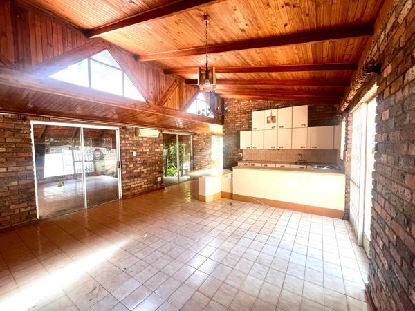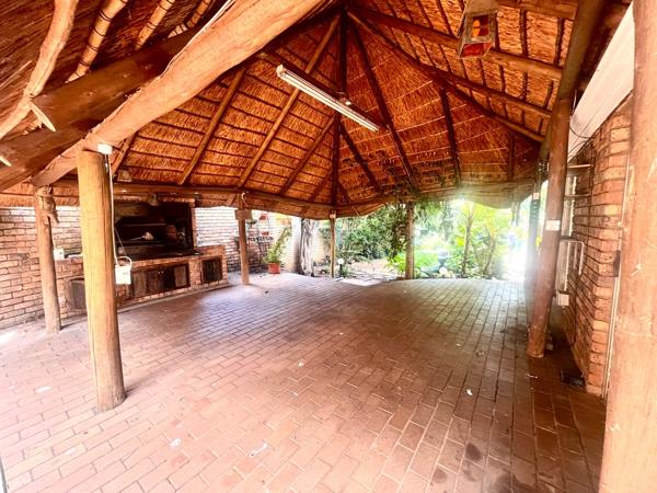 The open-plan kitchen and living area create a welcoming heart to the home with the elegant knotty pine ceilings infuse the home with warmth, character, and a naturally inviting ambience, seamlessly flowing out to a large Thatch Lapa with a built-in braai, creating an entertainers dream space for hosting family and friends all year round.