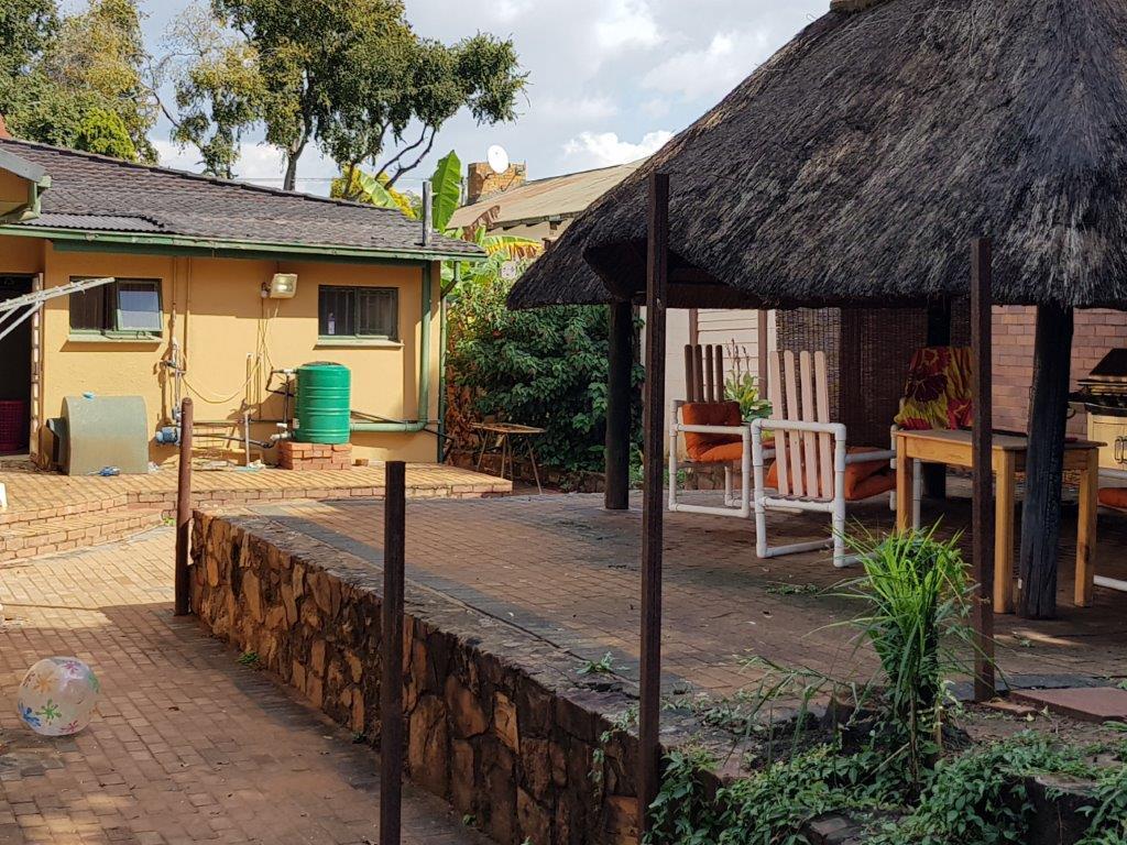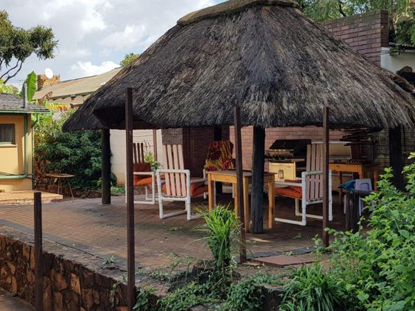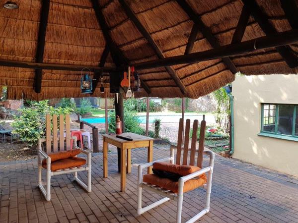 There is a small front garden area with lawn. The backyard is large and is made up by the following sections: Family entertainment area immediately off the Dining area of the house, a thatched braai area, large swimming pool filled with borehole water. Mature trees.