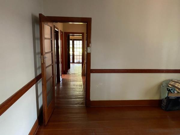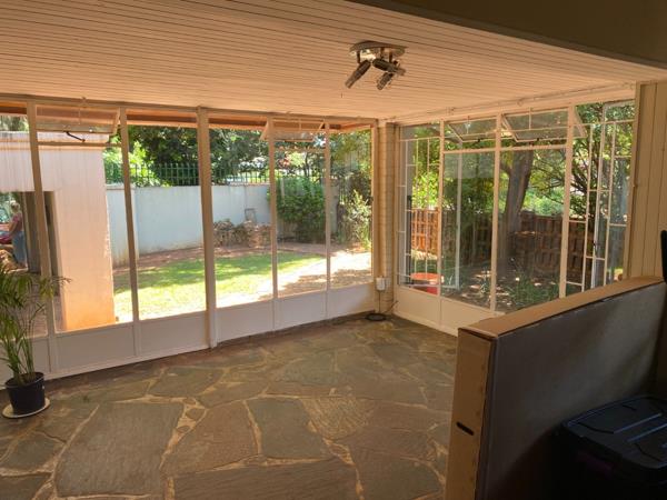 The house offers 3 north facing well sized bedrooms, each with an outside door and good security. 2 Bathrooms. There are 3 living areas, the first living area provides a lot of natural light and remind one of an old fashioned son stoep. The next living area, the lounge, still has beautiful wooden floors as well as oregan pine doors and frames. The dining room as a whole wall fitted with oregan cupbourds. The kitchen has been modernised with cherry wood cupboards and granite tops. The stove is gas and electrical.