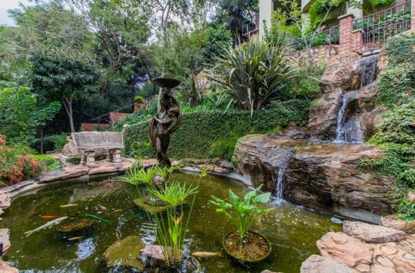 - A tranquil koi pond with a cascading waterfall