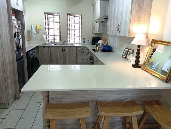- A modern upgraded kitchen with space for two front load appliances, a microwave hub, space for a single-door fridge, glass-top stove, oven, extractor fan, double basin and ample cupboards and drawers.