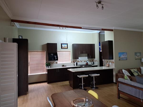 Sliding doors lead from the lounge onto a large, undercover patio with a built-in braai, overlooking a beautifully maintained wrap-around garden.