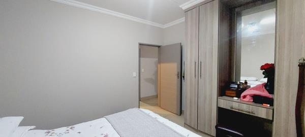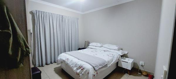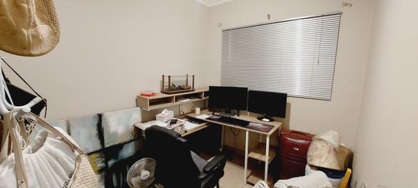 2nd Bedroom features as the main bedroom and offers tiled floors, 4-door built-in cupboard space with built-in desk and drawer, curtain rails.