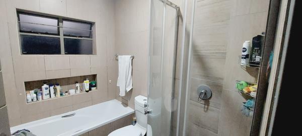 Bathroom in hallway has modern touched and features a bathtub, shower, basin, toilet and vanity cupboard.