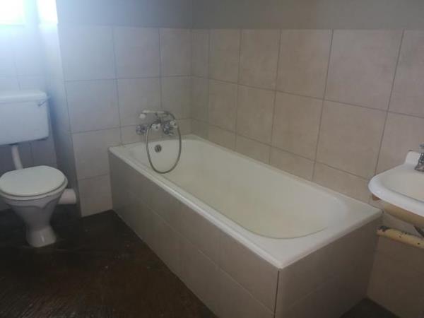 a bathroom equipped with a bath, basin, toilet and a combined shower