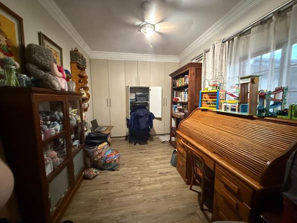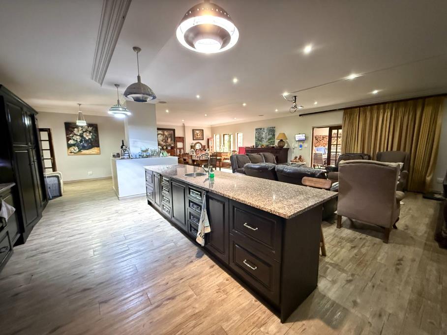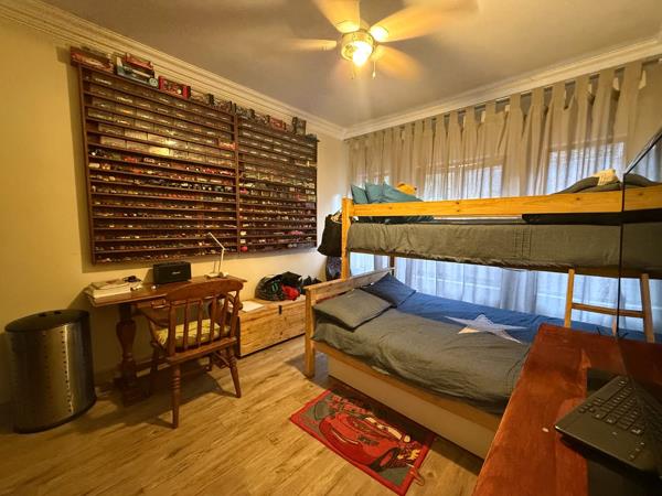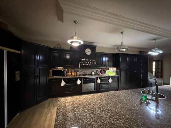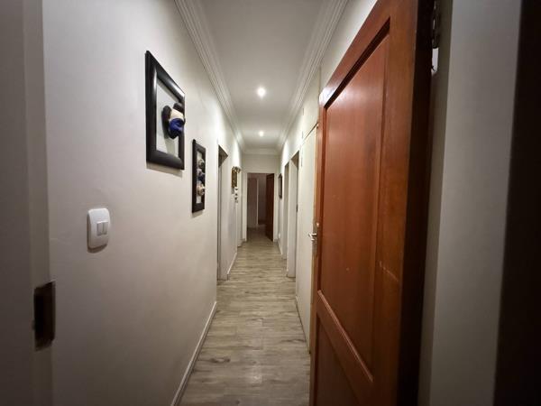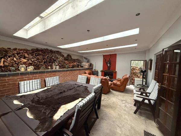 The main house boasts 4 spacious bedrooms, each equipped with built-in cupboards, and 2 luxurious bathrooms, including a master ensuite. The open-plan design seamlessly integrates the kitchen, living, and dining areas, extending into a charming braai room. The kitchen is a chef''s delight, featuring solid wood cupboards, a pantry, and a separate scullery. Parking is abundant with 5 vehicle garages and 3 open spaces. A geyser with a heat pump is neatly tucked outside under the stairs for energy efficiency.