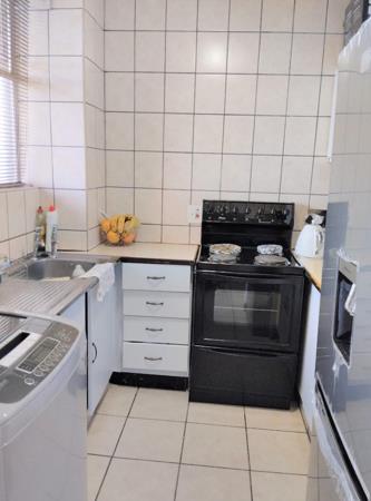 The bedroom features built-in cupboards, while the bathroom offers a basin, toilet, bathtub, and additional cupboard space, along with provisions for a washing machine. The kitchen is well-appointed with ample space for a single broad-door fridge and, if preferred, a tumble dryer.