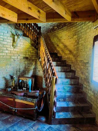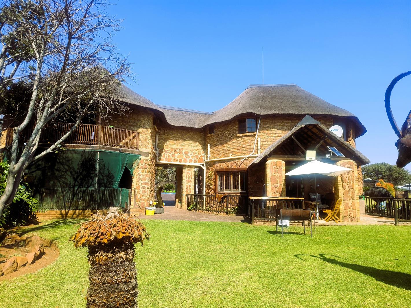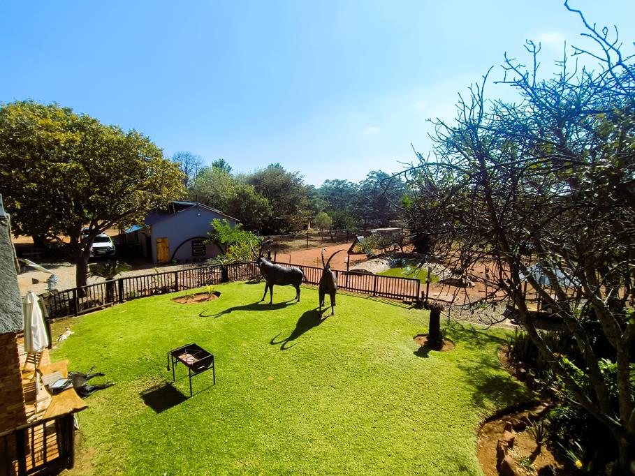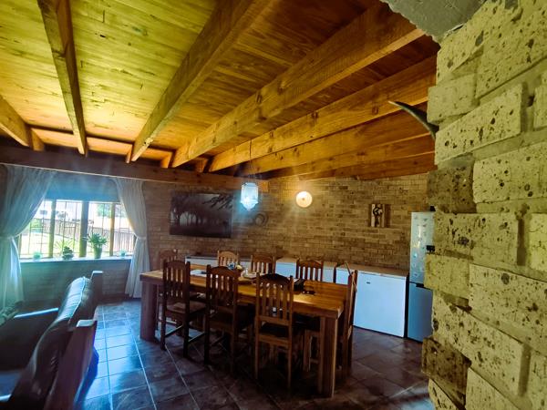 The main house spans 300 square meters and offers a beautifully appointed living space. It features three bedrooms and two bathrooms, with the main bedroom enjoying access to a private balcony with scenic views. The open-plan living and dining room leads to a welcoming patio, perfect for entertaining or relaxing. A separate kitchen is fitted with a gas stove and includes a pantry and laundry room. Additional amenities include a study, two garages, three carports, a sparkling 45,000-liter swimming pool, and a lapa with a built-in bar. The main house will be sold fully furnished, offering a move-in-ready opportunity.