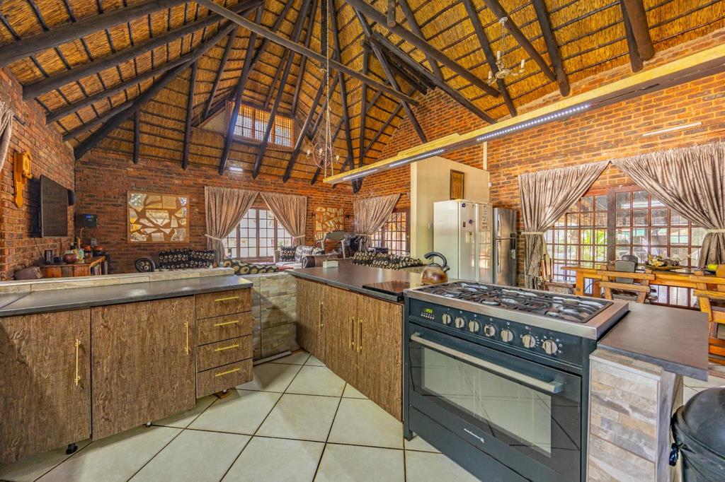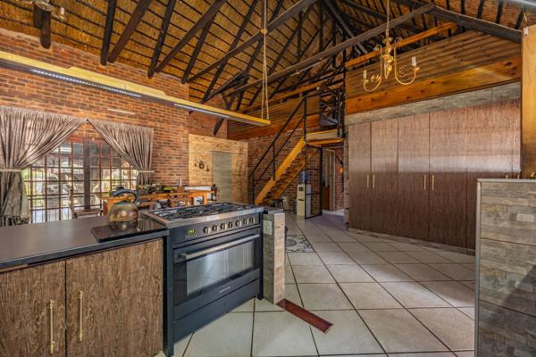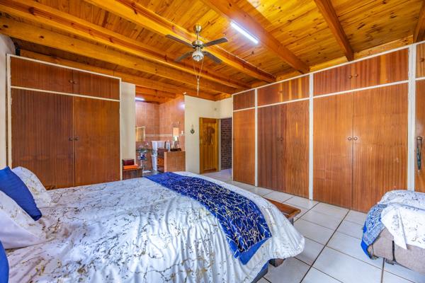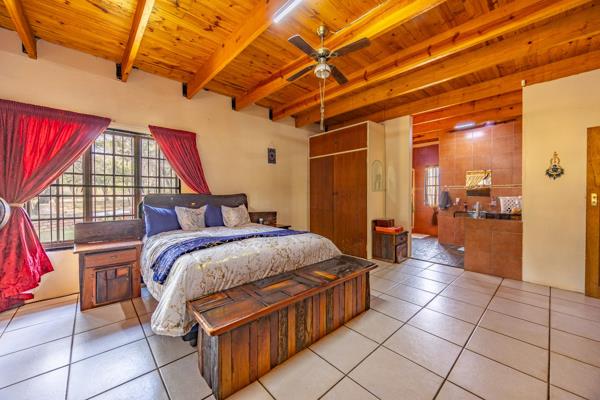 The main house features three well-sized bedrooms, including a generous main bedroom with a full en-suite bathroom. There is an additional full bathroom for the remaining two bedrooms. The kitchen is equipped with a gas stove, pantry, and a separate scullery for added convenience. A cozy loft area provides additional living space and can be used as a lounge, study, or playroom. The entertainment area is perfect for gatherings, with a thatched lapa, built-in bar, and comfortable seating space. A sparkling swimming pool adds to the relaxing atmosphere. The property also includes a vegetable garden and various fruit trees, along with a borehole for independent water supply.