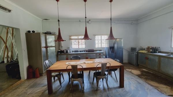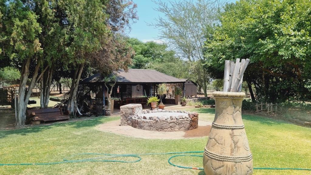 A safari lodge with African bush finishes catering for 5 hunters. The two plastered and painted brick structures under pitched thatch roofs offer 4 bedrooms and 5 bathrooms. There is a separate entertainment area with a self-catering kitchen dining and entertainment/play area under a thatch roof with natural stone walls.