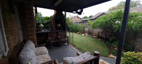 Living area walking out onto a patio with build-in braai, surrounded with a lay-out garden,