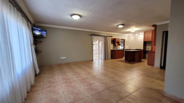 A spacious lounge and dining area designed with an open flow, Large sliding doors leading onto the covered patio creating seamless indoor-outdoor living. Covered entertainment area complete with a built-in braai, ideal for year-round gatherings.