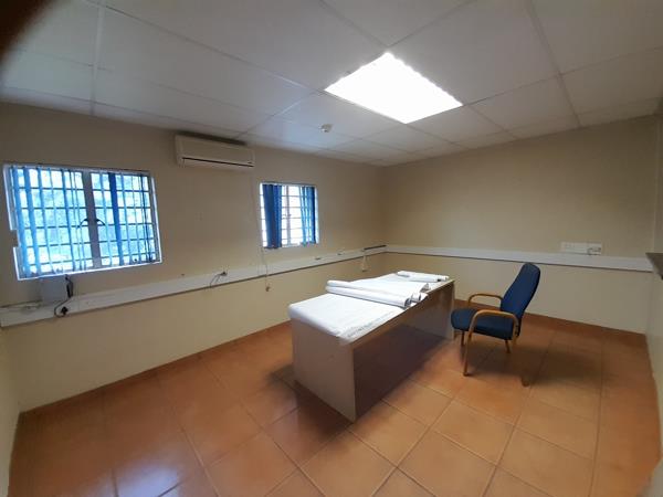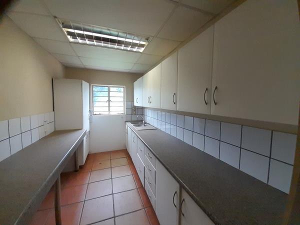 The interior boasts flexible, open-plan spaces, ideal for offices or multi-purpose use, complete with air conditioning, durable tiled flooring, and efficient fluorescent lighting. A dedicated kitchen area offers extensive counter space and cabinetry, complemented by a practical storage room with ample shelving. Restroom facilities are also available, featuring tiled walls and multiple cubicles.