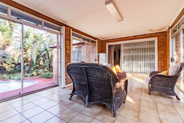 This property also includes a three-car garage, a tiled covered patio with a braai area and rhino board ceiling - ideal for outdoor entertaining. The well-maintained garden surrounds a sparkling swimming pool and is complete with a Wendy house for extra storage or use.