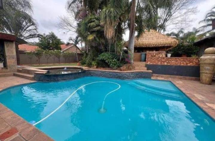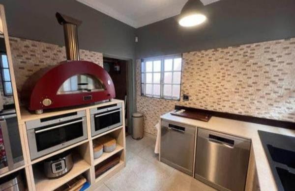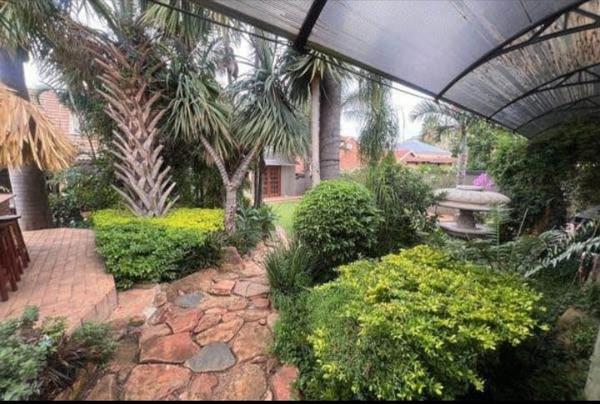Outdoor living is equally enchanting with a lapa featuring a built-in bar, overlooking a meticulously maintained garden adorned with a water feature and koi dam.