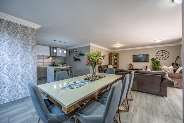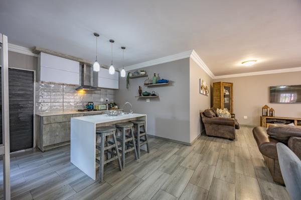 Step inside to an inviting open-plan layout, seamlessly connecting the modern kitchen, dining, and lounge areas. The kitchen is a focal point, featuring an island with seating, a gas hob, contemporary cabinetry, and stylish pendant lighting. Elegant wood-look tiled flooring flows throughout, complemented by crown molding and recessed lighting, creating a sophisticated ambiance. A stylish staircase with metal railings adds to the home''s modern aesthetic, while large windows ensure abundant natural light.
