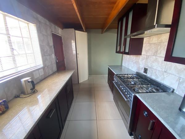 This fully walled well-maintained 3-bedroom home is situated in Annlin. The property is walled all around with automated gate in the front. You enter the home through a security door into the spacious living area. The large kitchen has built-in cupboards, granite tops, Gas Stove with gas hob and extractor fan, washing machine/dishwasher outlet, sink with double basin. The floors in the living room, passage and kitchen are tiled. Ceilings of the living room and kitchen are wood.