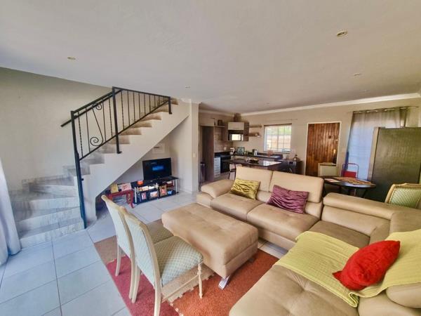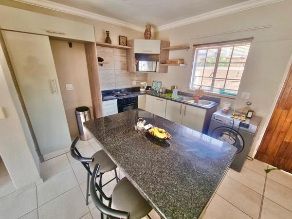 The modern, open-plan kitchen boasts granite countertops and a breakfast nook, while the dining and lounge areas flow seamlessly into a patio with a built-in braai, perfect for entertaining. The patio overlooks a beautifully maintained private garden, creating a serene outdoor space.