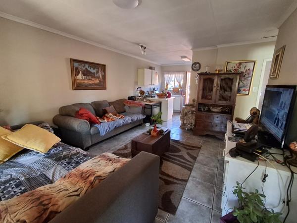 Step into a spacious open-plan lounge and dining area, fully tiled for easy maintenance and flowing seamlessly into a compact, well-equipped kitchen. The kitchen features ample counter space, a built-in stove, double sink, and thoughtful storage solutions.