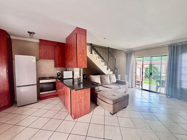 The ground floor features an open-plan kitchen, dining and living area that flows seamlessly onto a covered patio with a built-in braai, overlooking a spacious private garden perfect for entertaining or relaxing outdoors. The modern kitchen includes direct access to a courtyard, while a guest toilet and single garage with direct access to the home add extra convenience.