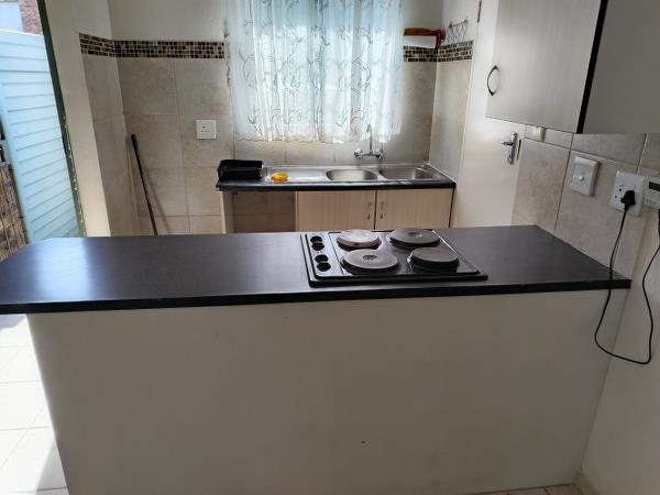 This unit offers one bedroom fitted with built-in cupboards and one bathroom equipped with a bathtub, basin, and toilet. It includes a kitchen with built-in cupboards and a comfortable lounge area.