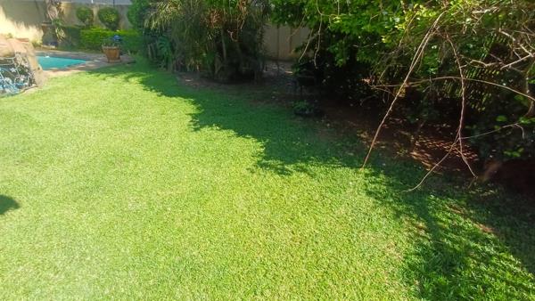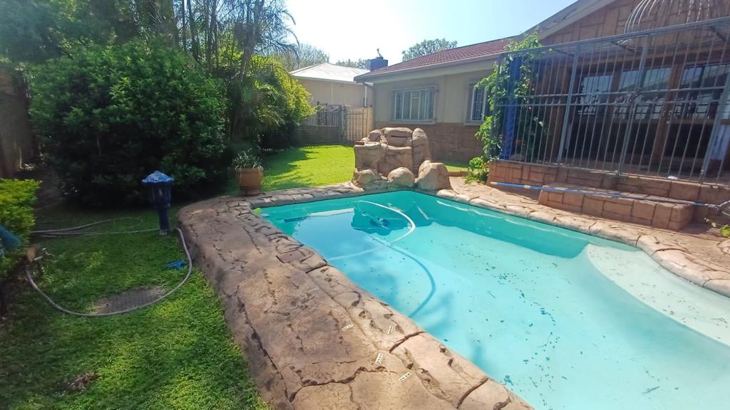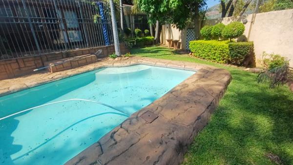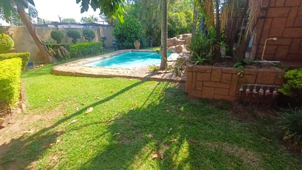 Outdoor living is a standout feature, boasting a lush, well-established garden, a sparkling swimming pool, and a lapa, ideal for entertaining. Additional features include a domestic room with bathroom, double garage, two covered carports, pre-paid electricity, and a borehole ensuring reliable water supply.