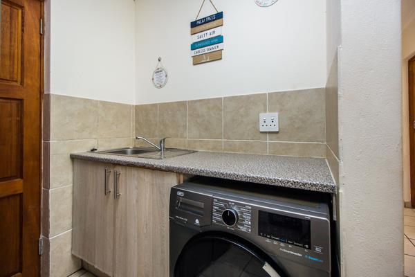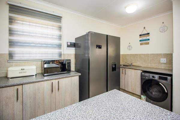 - The kitchen is spacious and fitted with cupboards, granite top, a stove, an oven and has a frontloader washing machine compartment.