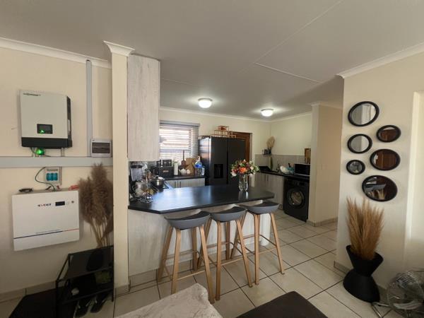 Outside, youll love the well-kept, pet-friendly garden complete with a patio and built-in braai perfect for entertaining family and friends. The property is equipped with a 5kVA backup inverter, ensuring peace of mind during load-shedding. Electricity is prepaid, and water is conveniently included in the levies.