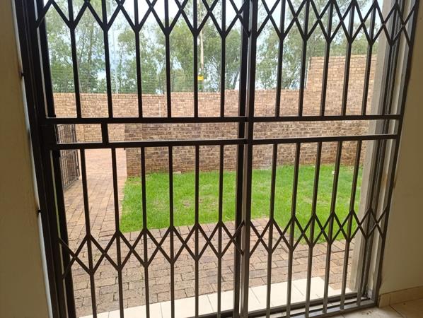 The living area is bright and airy, benefiting from a large sliding glass door that opens directly onto a private outdoor space. This area includes a paved patio and a small lawn, perfect for relaxation or entertaining. Enhanced security is a key feature, with a robust security gate on the sliding door and security bars on windows, offering peace of mind within the secure estate environment.