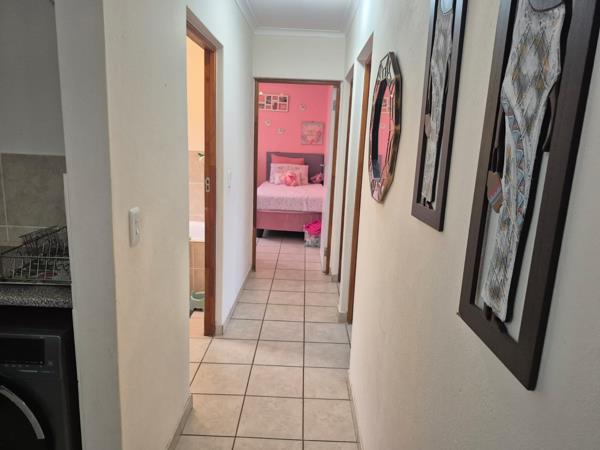 This charming townhouse offers a perfect blend of modern living, comfort and security ideal for families or first-time homeowners seeking peace of mind and convenience. The home features three well-proportioned bedrooms with built-in cupboards, and two bathrooms, including a main-bedroom en-suite. Inside youll find a neat kitchen with fitted cupboards and granite countertops, a tiled floor throughout, and generous living and dining areas designed for everyday living and entertaining. Outside, the property includes covered parking and a small garden a pleasant outdoor space to enjoy.