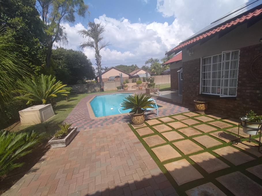 Step into luxury with amenities such as a borehole and irrigation system ensuring lush greenery all year round, while the sparkling swimming pool invites you to cool off on hot summer days. Entertain guests effortlessly in the indoor braai area or gather around the boma for cosy evenings under the stars. With a solar system comprising 12 panels, 2 x 5kw batteries, and a 10kw inverter, say goodbye to loadshedding woes. The open-plan layout seamlessly connects the lounge, TV room, dining area, and kitchen with cherry wood finishes and a scullery. Complete with an office space and meticulously maintained garden, this turnkey property is ready for you to move in and make it your forever home.