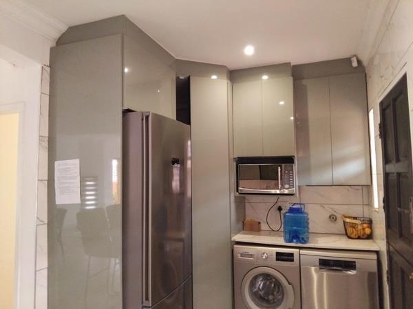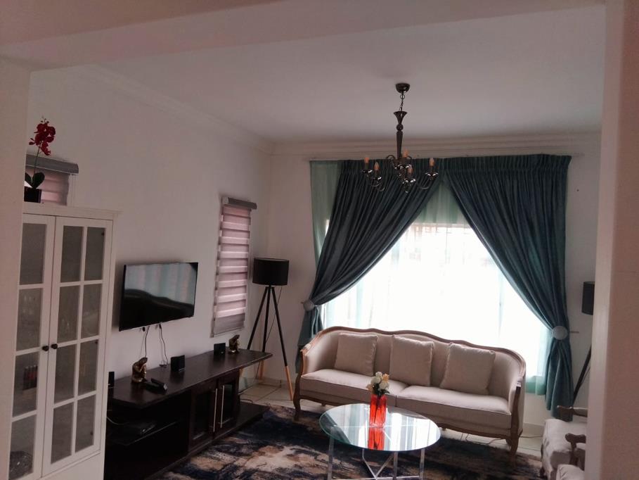 The property features a serene ambiance and an open-plan layout that seamlessly connects the living room and kitchen. The kitchen is equipped with high-quality finishes and a gas stove. The master bedroom includes an ensuite bathroom, and the two additional bedrooms share a separate bathroom. A domestic room with a private bathroom is also available.