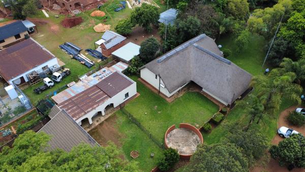 Discover peaceful country living on this 1-hectare plot featuring a beautifully maintained modern thatch home surrounded by tall trees and a serene garden. The inviting patio leads into a spacious lounge with laminate flooring, a dining area, and a charming bar fitted with a Rhodesian teak counter. The stylish kitchen offers granite tops, a pantry, and a gas hob, while the home includes four generous bedrooms with built-in cupboards. The main bedroom boasts a full ensuite bathroom. Added convenience includes prepaid electricity, a security system with CCTV, an outside laundry, storeroom, and a 3-car garage.
