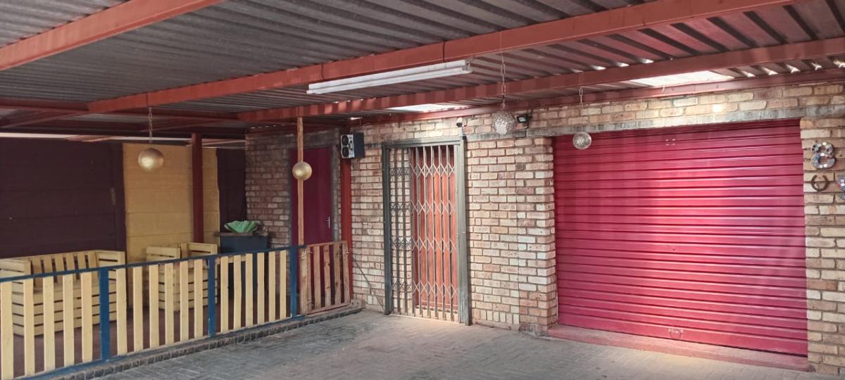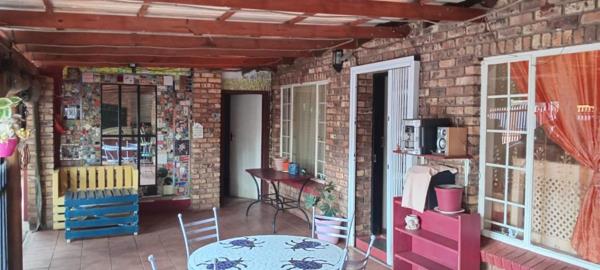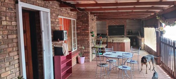 Big enclosed patio with a built-in braai and jacuzzi, all overlooking a neat garden and swimming pool.