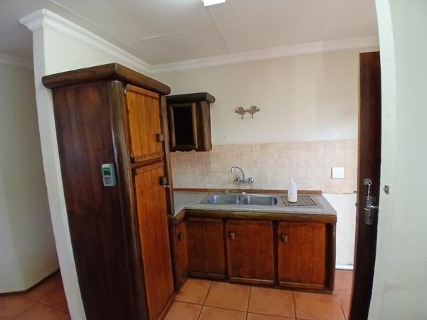 It features tiled floors throughout and boasts a spacious, open-plan kitchen with ample built-in cupboards and a gas stove, lounge, and dining area.